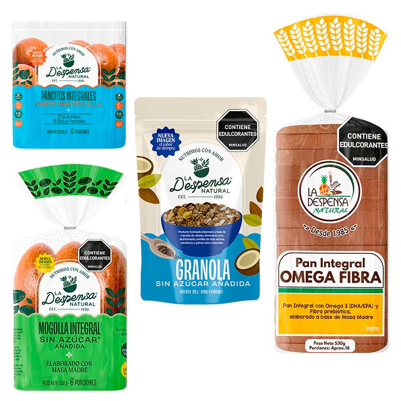 - Contamos con una línea libre de azúcares añadidos que está compuesta por: pan integral sin azúcar añadida, pan integral con omega fibra, Mogolla sin azúcar añadida, tostadas integrales sin azúcar añadida y granola sin azúcar
